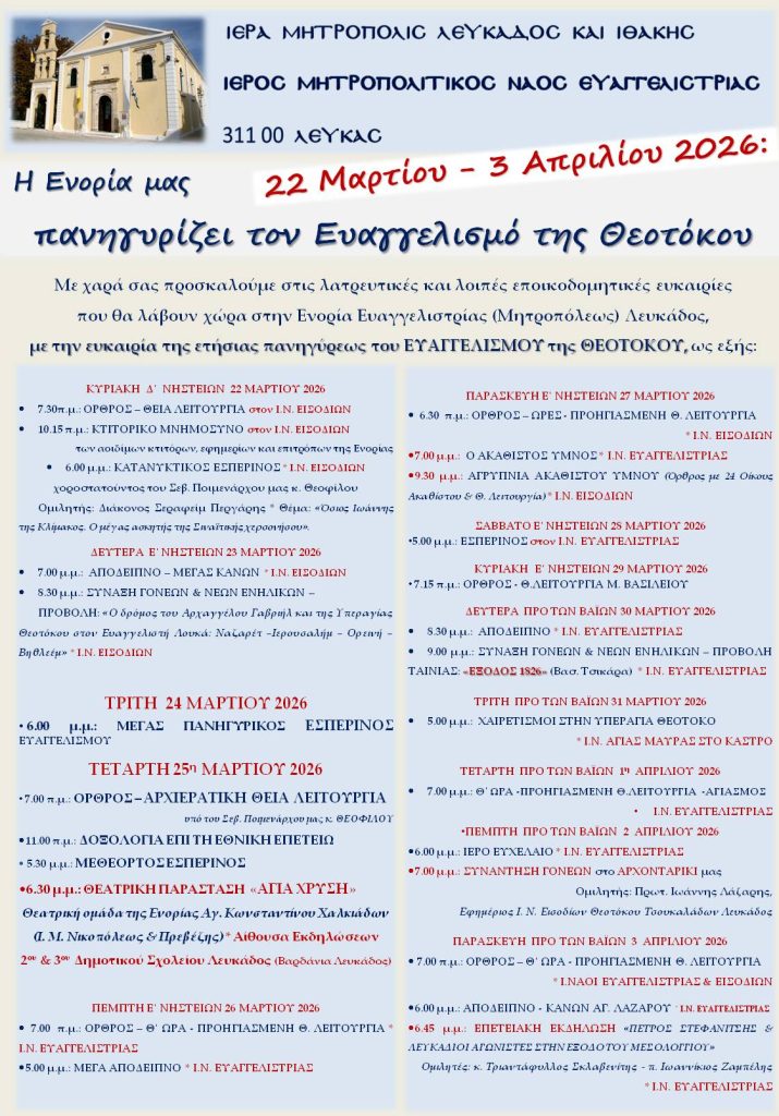 Γίνεται γνωστό ότι στην Ενορία Ευαγγελιστρίας (Μητροπόλεως) Λευκάδος, με την ευκαιρία της ετήσιας πανηγύρεως του ΕΥΑΓΓΕΛΙΣΜΟΥ της ΘΕΟΤΟΚΟΥ, θα λάβουν χώρα λατρευτικές ευκαιρίες και λοιπές εποικοδομητικές εκδηλώσεις σύμφωνα με το εξής πρόγραμμα:
