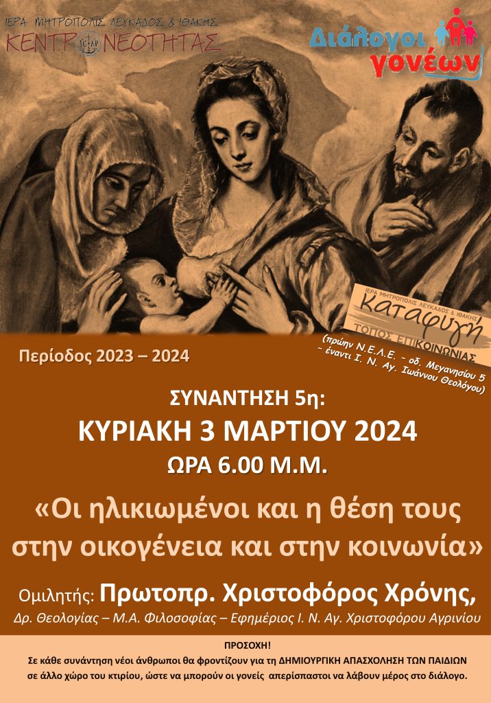 Ο Αιδεσιμολογιώτατος Πρωτοπρεσβύτερος π. Χριστοφόρος Χρόνης, εφημέριος του Ι. Ναού Αγίου Χριστοφόρου Αγρινίου, Δρ. Θεολογίας και Μ.Α. Φιλοσοφίας έρχεται να προσεγγίσει μέσα από την επιστημονική του κατάρτιση και την ποιμαντική του πείρα το θέμα: «Οι ηλικιωμένοι και η θέση τους στην οικογένεια και στην κοινωνία», στην πέμπτη συνάντηση των «Διαλόγων Γονέων» που διοργανώνει το Κέντρο Νεότητας της Ι. Μητροπόλεως Λευκάδος και Ιθάκης.